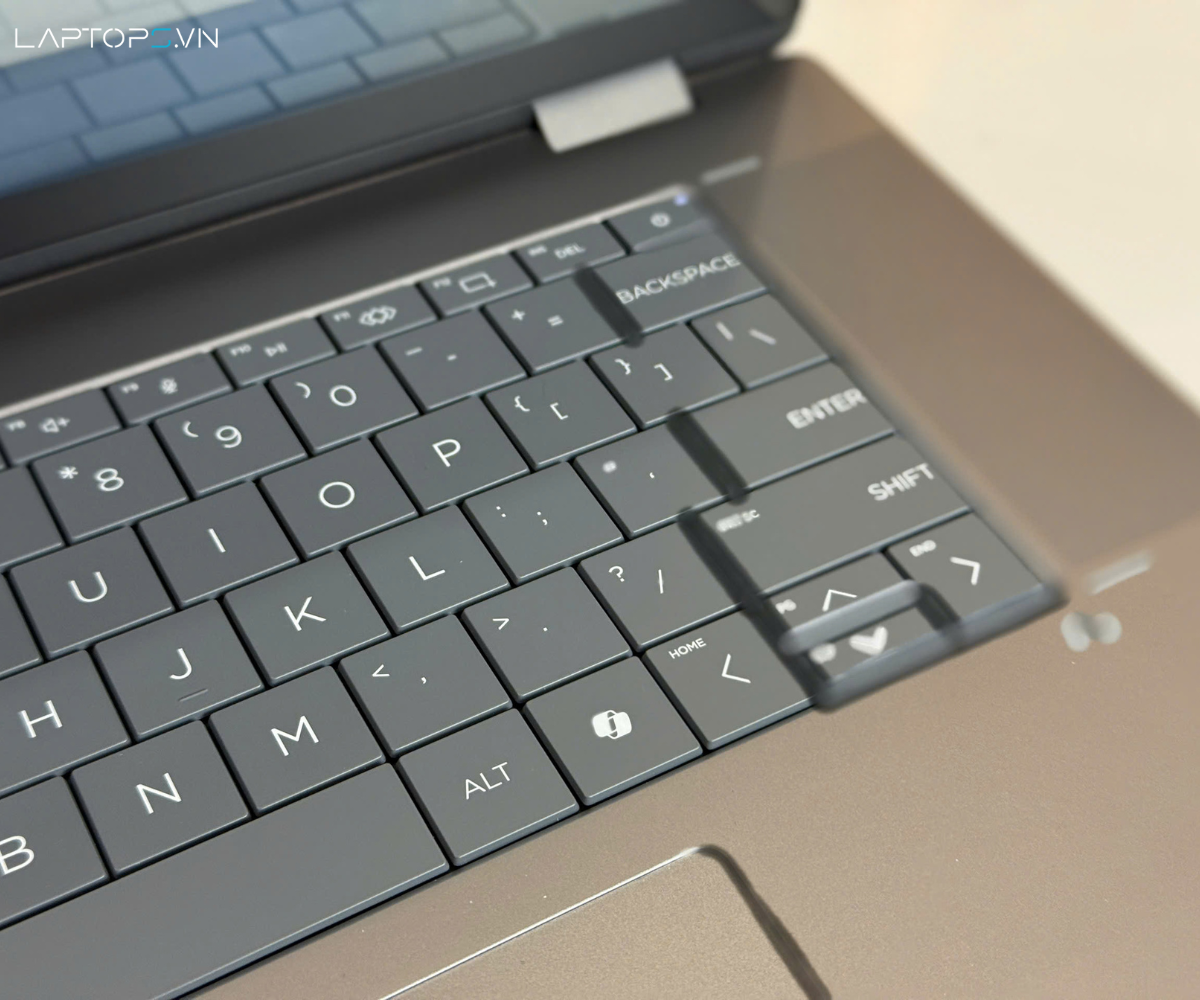 Bên dưới là phần touchpad Haptic bằng kính liền mạch với chiếu nghỉ tay. Bàn di chuột này mang lại phản hồi xúc giác chính xác và bề mặt cực lớn, cho phép thao tác đa điểm mượt mà. Tuy nhiên, việc không có ranh giới vật lý rõ ràng có thể cần một chút thời gian để làm quen.